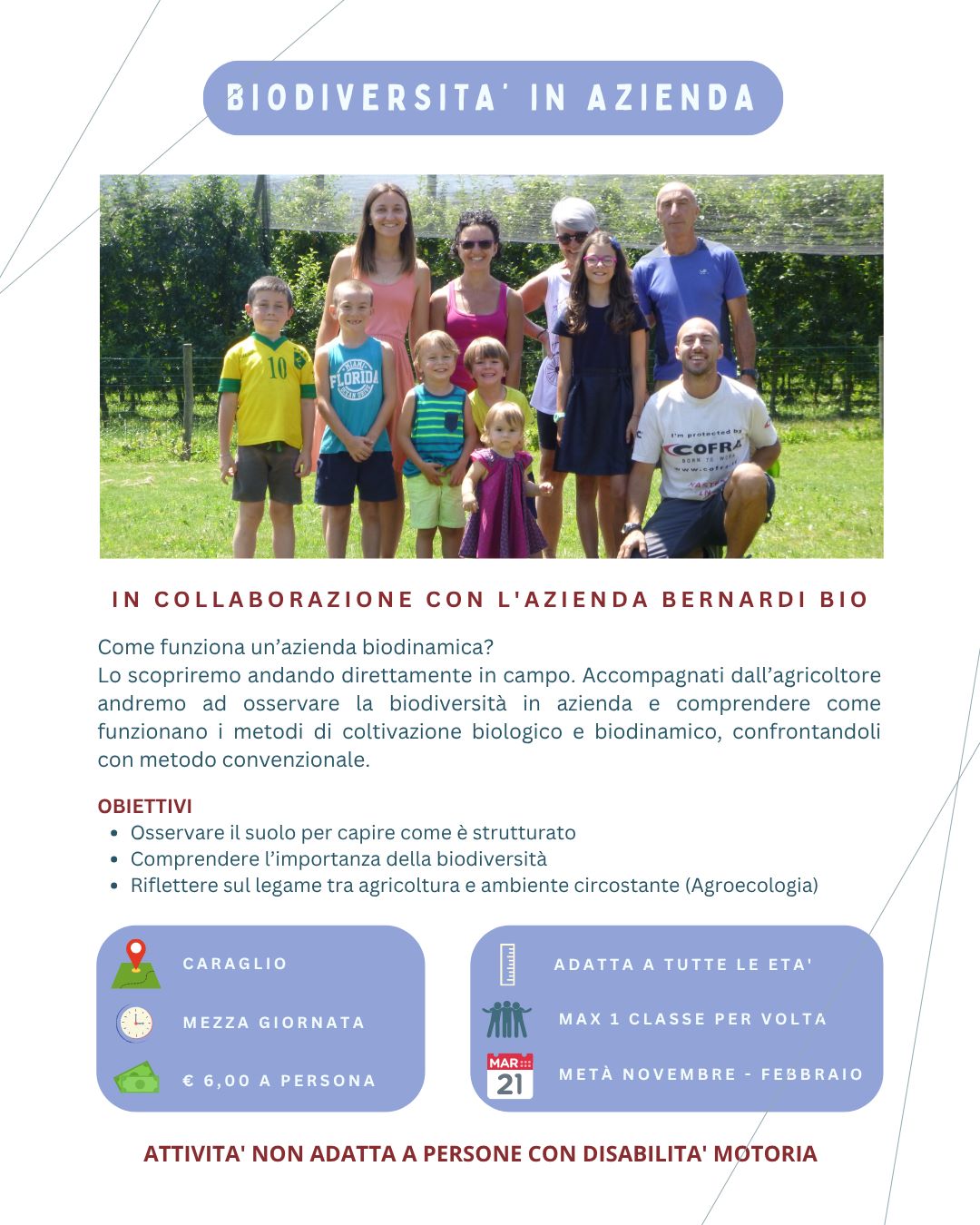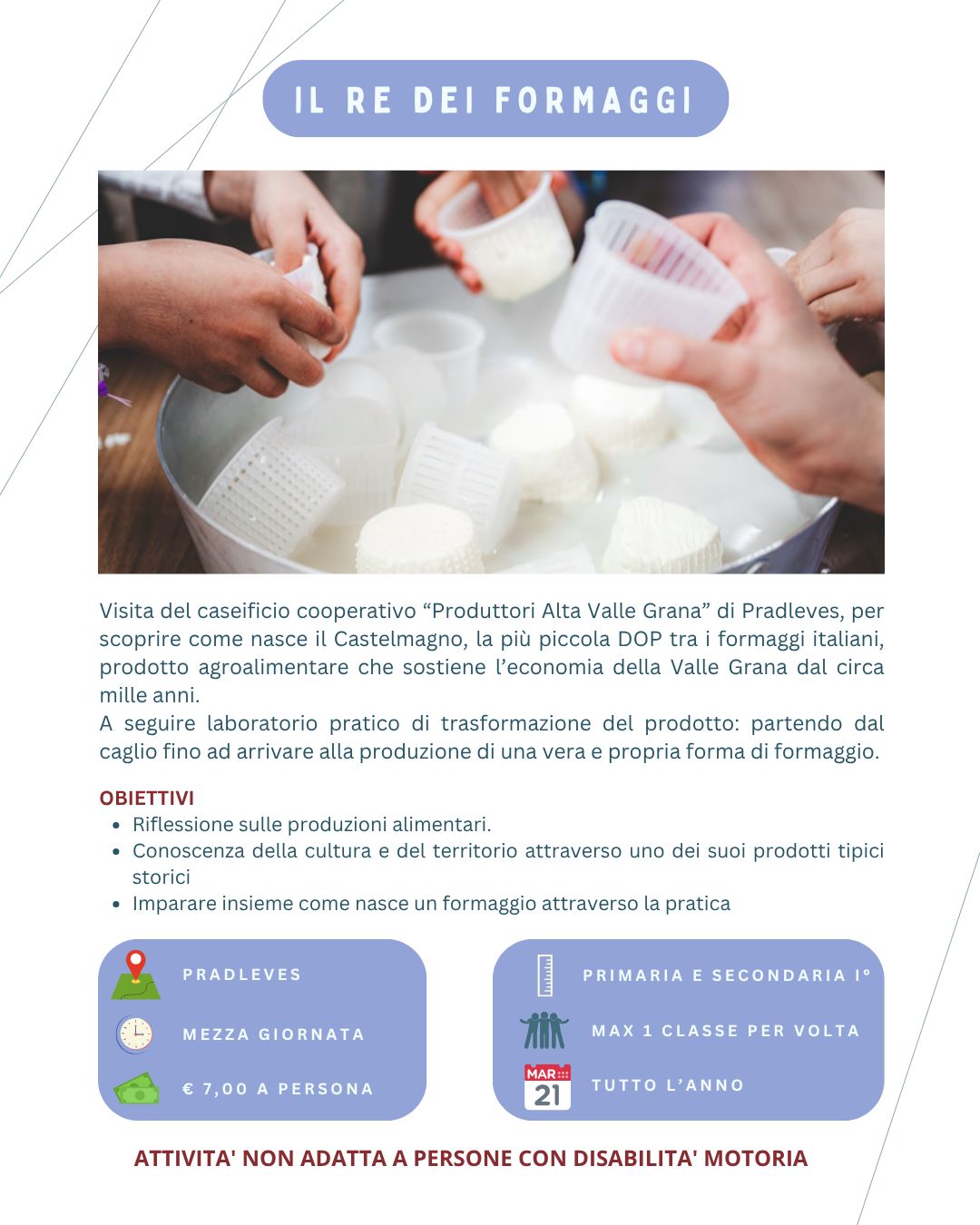 I boschi, i torrenti, le nostre aziende agricole, custodi di saperi e sapori rari e preziosi, i sentieri, i fiori… tutto all’occorrenza può trasformarsi in un laboratorio diffuso sul territorio e farci riflettere su un corretto rapporto tra uomo e natura.